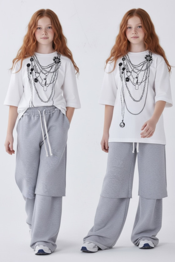 Rozmiary Nowość Komplet 3-częściowy Look Style bluza, t-shirt, spodnie, jasny szary 269,99 zł Cena 128 134 140 146 152 158 164